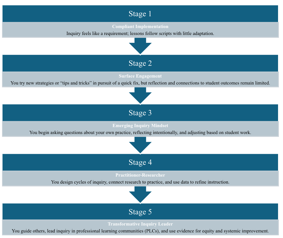 Every teacher approaches inquiry differently, and that’s okay. Think of inquiry not as a fixed method, but as a continuum of practice you can grow along. Use the Inquiry Continuum Self-Assessment we’ve developed to reflect on your current stage.